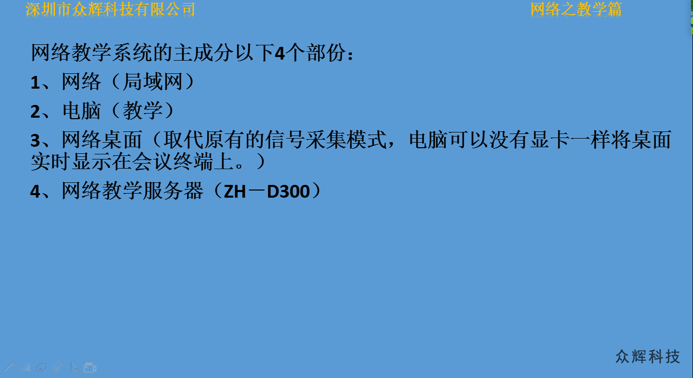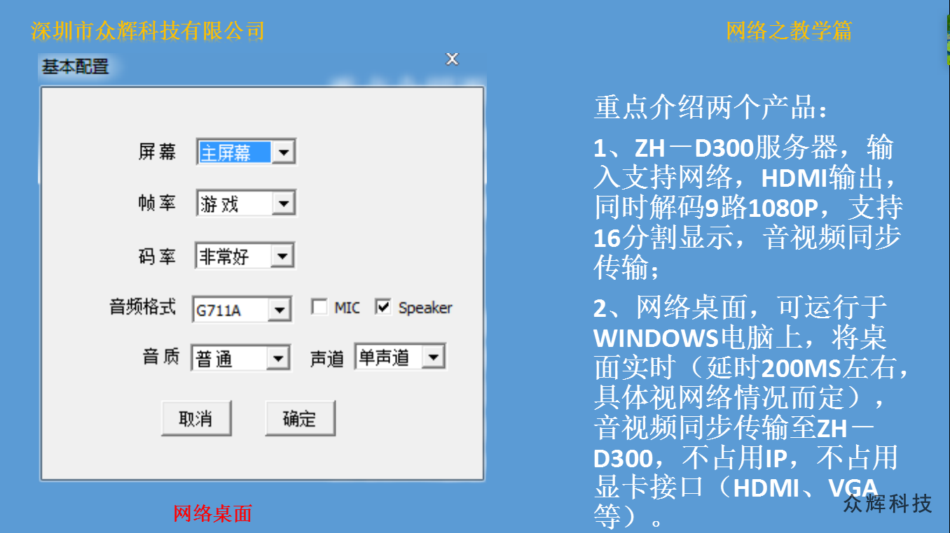 網(wǎng)絡桌面是我公司在WINDOWS系統(tǒng)上研發(fā)的一款電腦同屏軟件,只需要將電腦接入局域網(wǎng),即可完成音視頻同步在ZH-N3000(網(wǎng)絡拼接系列產(chǎn)品)、ZH-D300(網(wǎng)絡拼接處理器)和ZH-N230(網(wǎng)絡版電視拼接處理器)等設備上,實現(xiàn)液晶拼接大屏同步顯示。